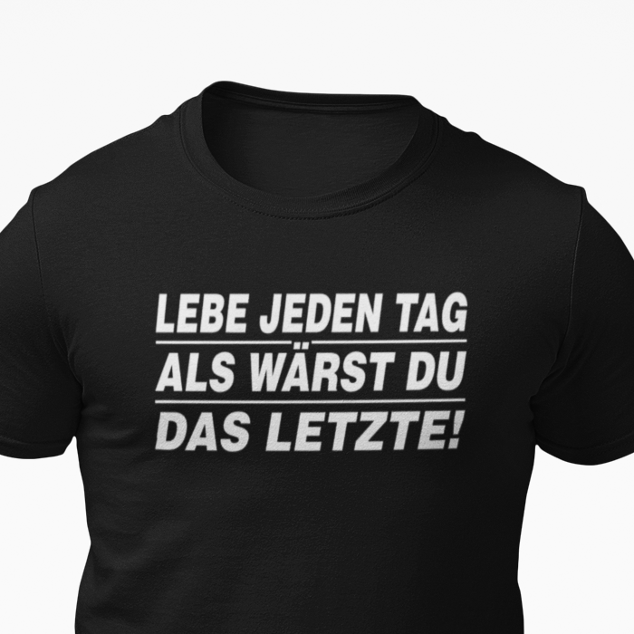 Lebe jeden Tag in diesem witzigen Shirt mit dem Spruch "Lebe jeden Tag als wärst du das Letzte!" Lass dich von seiner amüsanten Persönlichkeit inspirieren und genieße jeden Moment. Ein Must-Have für alle, die das Leben nicht zu ernst nehmen wollen!