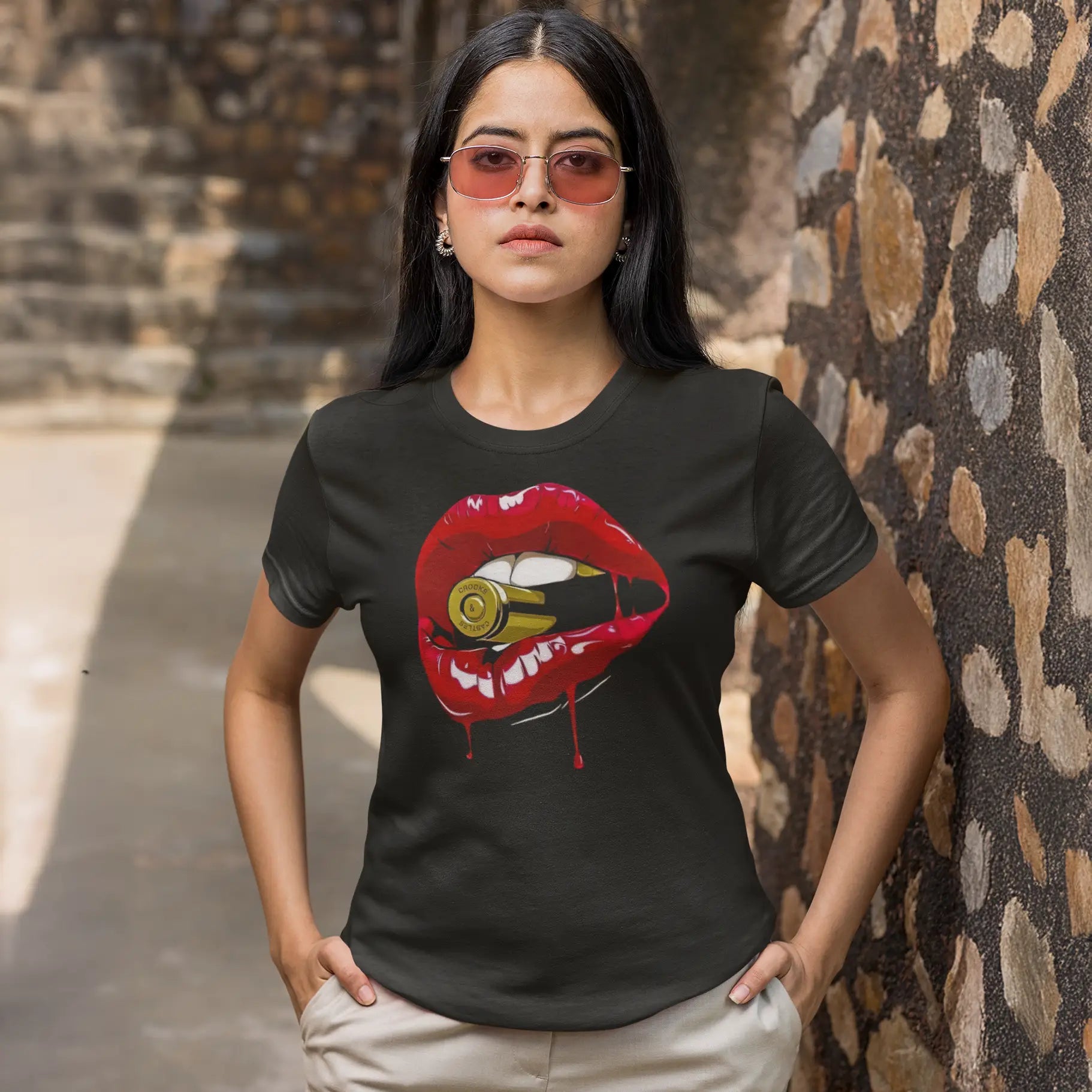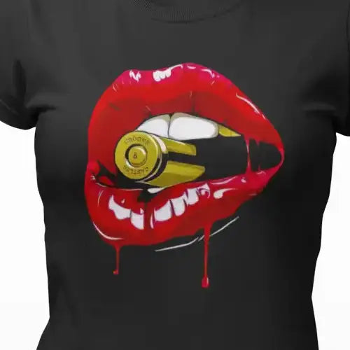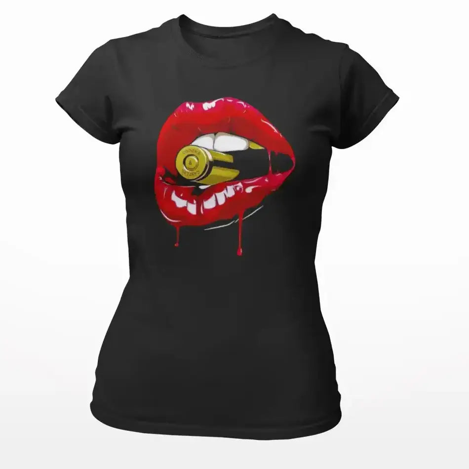 Stoße mit dem KiSS-Shirt für Frauen an deine Grenzen! Mund und Lippen zeigen Stärke, die Gewehrkugel symbolisiert deine Risikobereitschaft. Mit diesem Shirt fühlst du dich unbesiegbar und bereit, jede Herausforderung anzunehmen!