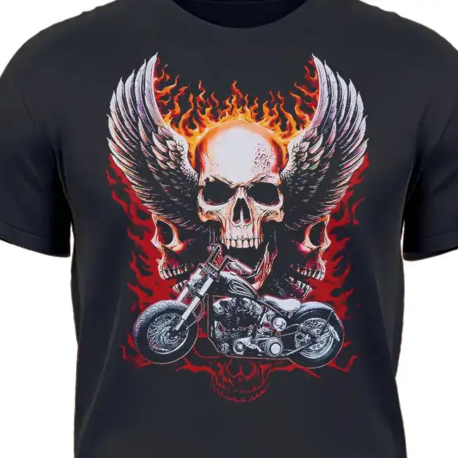 Totenkopf und Flügel verschmelzen zu einem atemberaubenden Design, das jeden Motorrad-Liebhaber begeistern wird. Mit diesem T-Shirt bringst du deine Leidenschaft für das Biker-Leben zum Ausdruck. Zeige deine rebellische Seite und hebe dich mit dem Totenkopf mit Flügeln von der Masse ab!